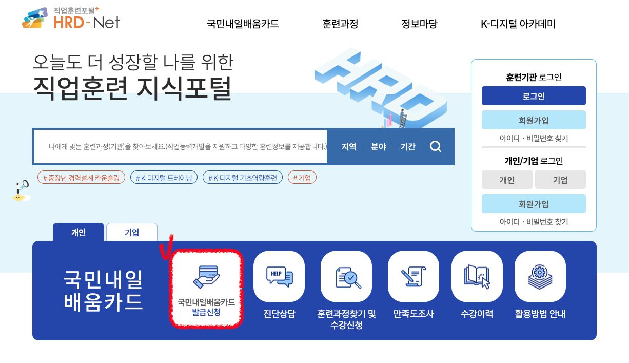 HRD-Net 홈페이지 로그인 후 메인화면에서 '국민내일배움카드 발급신청'으로 이동