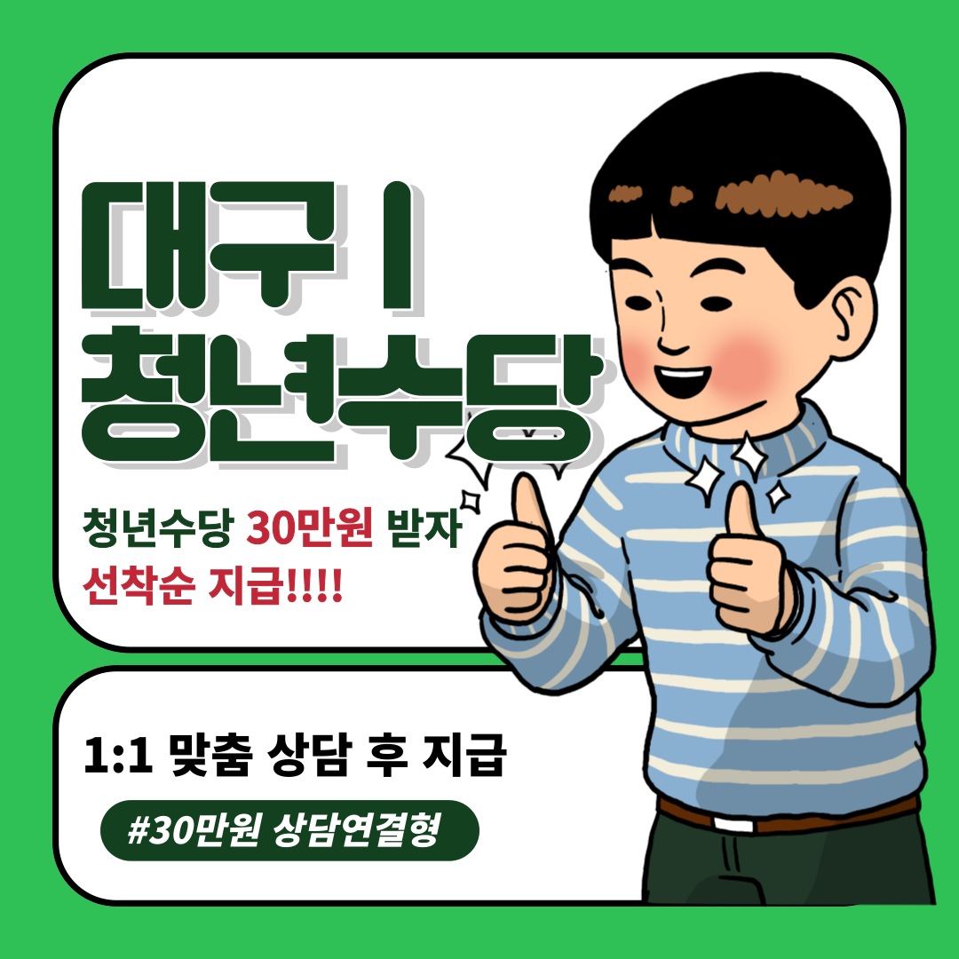 대구시 청년들의 진로, 창업, 부채, 취업, 등에 대한 여러 고민을 1:1 맞춤으로 상담 후 사회 진입 활동에 도움을 주기 위한 청년수당 30만원, 1회 상담을 실시 후 선착순으로 지급한다고 하오니, 대구 청년들은 놓치지 마시고 꼭 받아가시라!