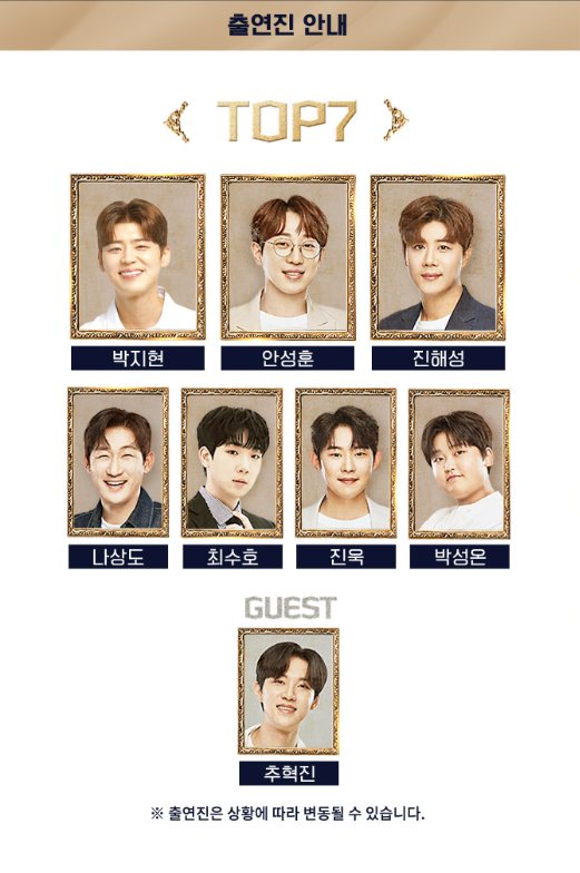 - TOP7 : 안성훈, 박지현, 진해성, 나상도, 최수호, 진욱, 박성온