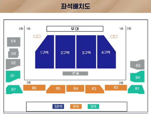 - G,R,B구역은 2층.(계단식 객석) 일부 좌석은 무대 연출 및 아티스트의 위치에 따라 안전펜스 및 콘솔, 출입문 위치, 무대구조물, 장치, 카메라 등으로 인해 시야가 방해가능.(이로인한 티켓 취소, 교환, 환불은 불가)