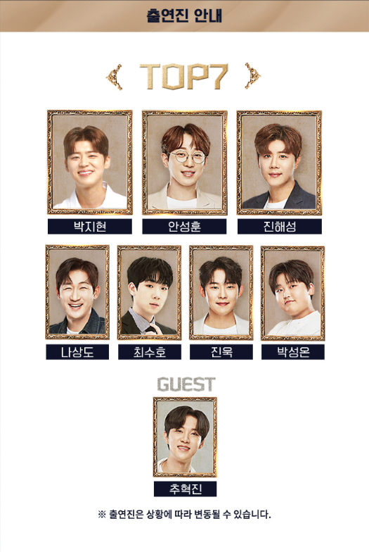 - TOP7 : 안성훈, 박지현, 진해성, 나상도, 최수호, 진욱, 박성온