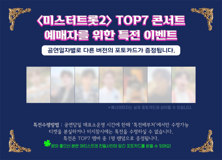 - 이로 인한 티켓의 교환 및 환불은 절대 불가. (가급적 여유있게 도착하셔서 공연시작 10분 전까지 입장을 완료해주시기 바랍니다.)