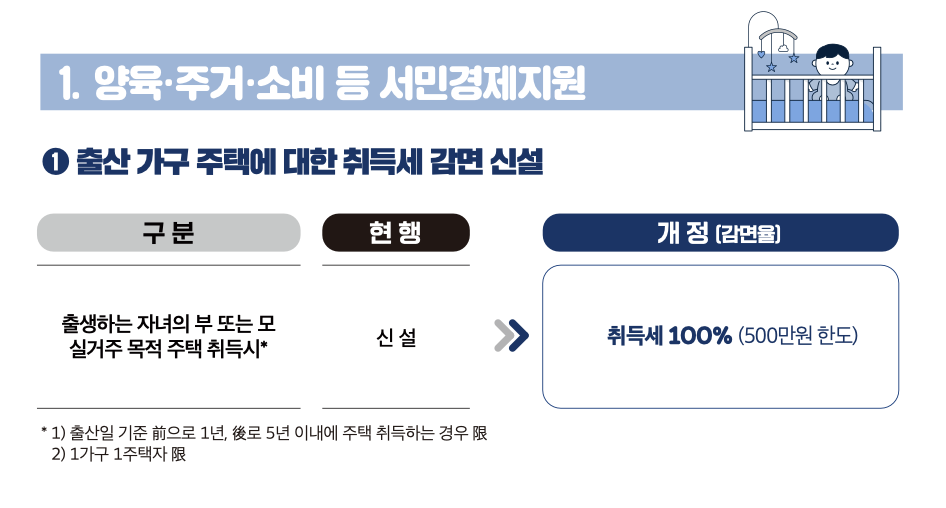 2024년 1월 1일 부터 2025년 12월 31일 까지 기간 내 신생아를 출산한 가구가 거주용 부동산을 취득시 최대 500만 원 한도에서 취득세를 100% 감면해 주는 제도가 시행됩니다.