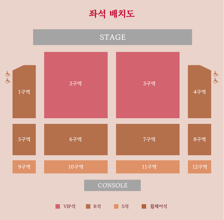 - 2,3구역 1~1열은 예매시 1인 2매로 제한되며, 할인적용 불가. (해당 좌석은 현장 티켓 수령 가능)